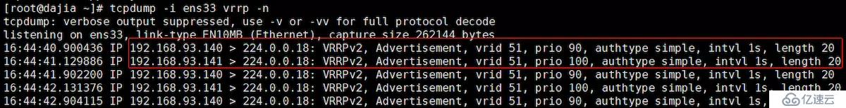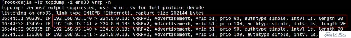 由上图可以看到,192.168.93.140和192.168.93.141两个IP在轮流发送组播信号。而正常的应该是由MASTER服务器发送组播,如果BACKUP收不到MASTER的组播信号了,那么判定MASTER宕机了,BACKUP就会接手VIP